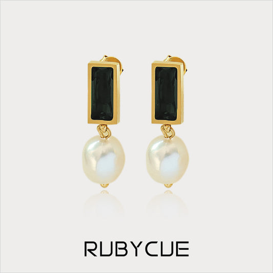 Stainless Steel Baguette Emerald Cubic Zirconia & Freshwater Pearl Drop Earrings