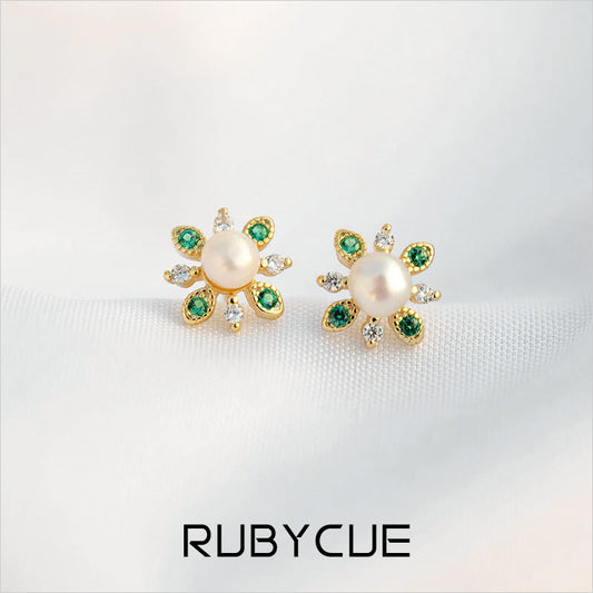 Sterling Silver Pearl and Emerald Cubic Zirconia Stud Earrings