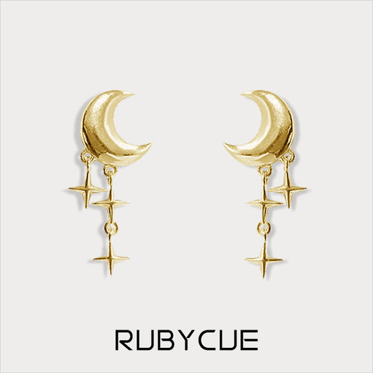 Sterling Silver Moon With Stars Drop Stud Earrings